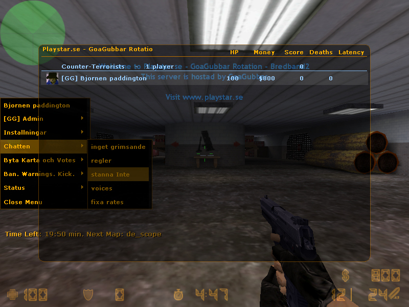 Suttit och lekt på AMX Mod X på Listen server nu när jag varit "sjuk". Och gjort en replika utav Playstar's server. Och undrar om någon är intresserad av att Playstar gör om FY_ eller AIM_ servern till Rotation - så som mitt listenserver exempel. Jag ska erkänna, det var säkert 10 år sedan jag höll på med AMX och alla config filer och så. Men när man kommer in i det igen, så är det inte så farligt.
